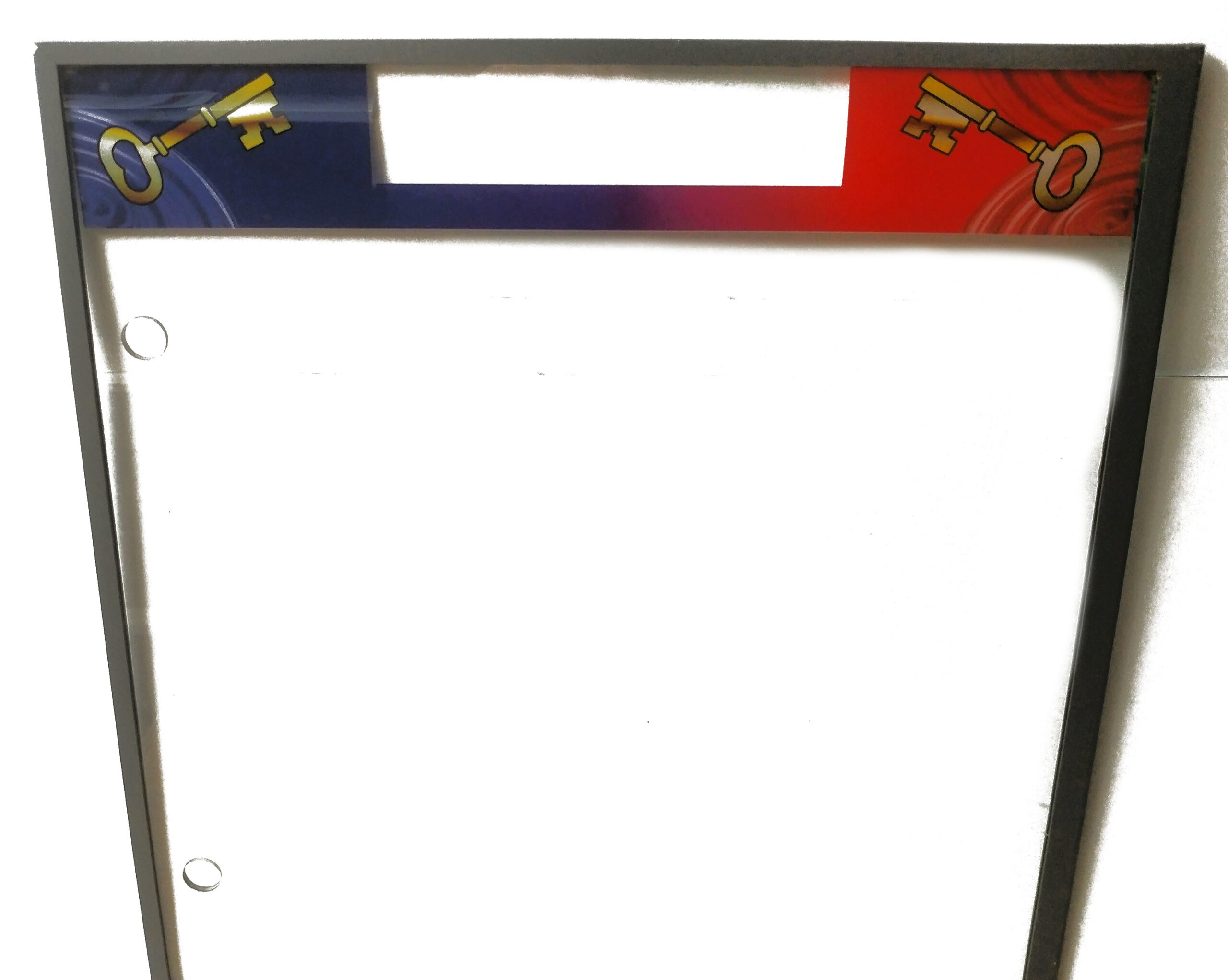 Original series Find-A-Key front door glass with stop/light game graphic cutout at top center of glass.